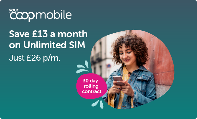 The sky’s the limit with Unlimited Data only £26 instead of £39 p/m with Your Co-op Mobile. What do you get for that £26? Unlimited mins, texts and data, award-wining customer service, Superfast 5G, free EU roaming, Wi-Fi Calling and a carbon neutral difference, all on the UK’s fastest and most reliable network, with a flexible 30 day rolling contract commitment.