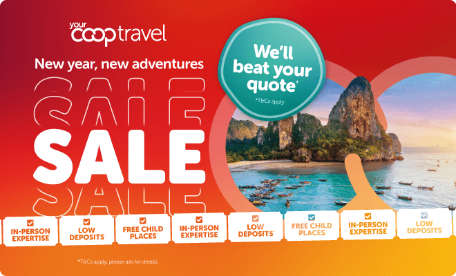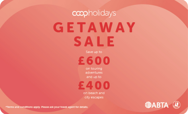 Ready for a break? Now’s the perfect time to book it. With Co-op Holiday’s Getaway Sale, you can save up to £400 on your next beach escape or city break, or enjoy even bigger savings of up to £600 on an unforgettable touring adventure.